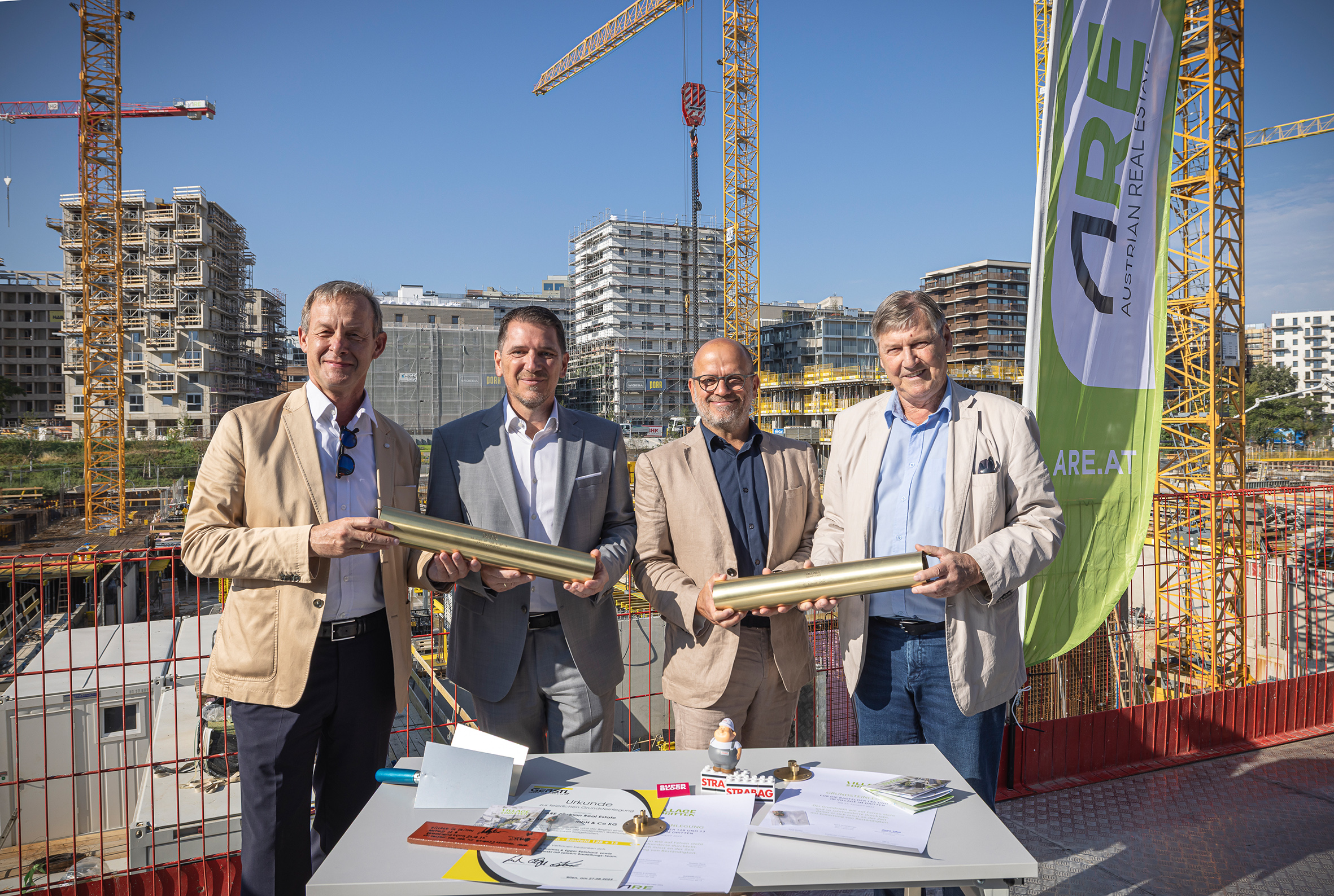 Die Quartiersentwicklerin ARE Austrian Real Estate (ARE) hat die finale Bauphase des Stadtquartiers Village im Dritten eingeläutet. Entlang der Otto-Preminger-Straße entstehen bis 2027 die letzten vier Wohnprojekte mit insgesamt 516 freifinanzierten Eigentums- und Mietwohnungen. „Mit dem heutigen Spatenstich für die Baufelder 12B, 13, 14A und 14B gehen wir in die Zielgerade der Quartiersentwicklung“, sagte ARE-Geschäftsführer Gerald Beck beim offiziellen Baustart. Gemeinsam mit Bezirksvorsteher Erich Hohenberger, Strabag-Bereichsleiter Markus Gornik und Gerstl-Geschäftsführer Thomas Pech wurden Zeitkapseln befüllt und einbetoniert.