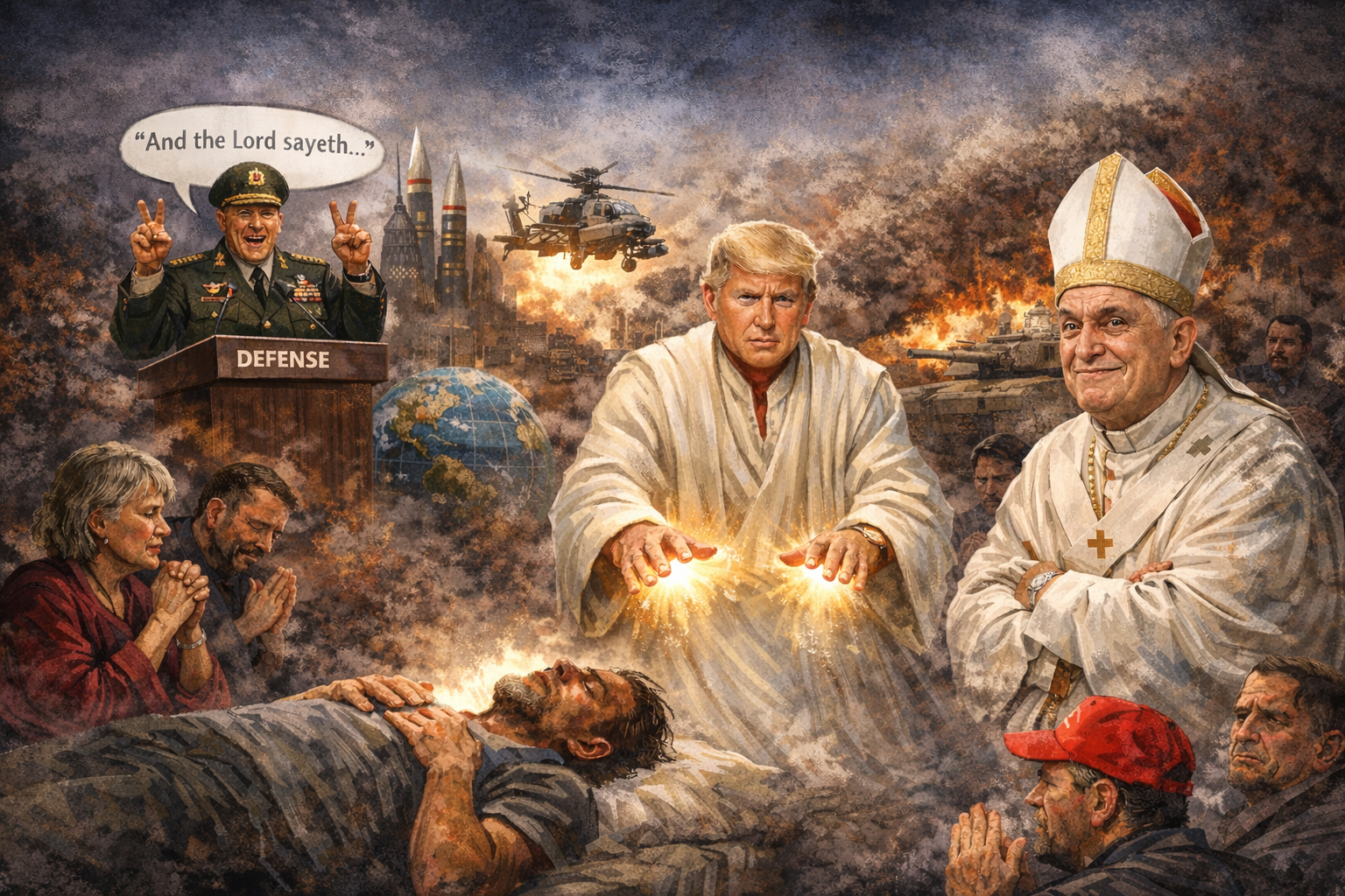 Ein Präsident einer Globalmacht postet ein Bild von sich selbst als Erlöser, während der einen Papst von A bis Z alles heißt, weil letzterer evangeliumsgetreu gegen Kriege aufruft. Auf dem Bild ist der Präsident zu sehen, mit langer weißer Robe und mit Lichthänden, mit denen er einen Sterbenden heilt, während Menschen ihn dabei anbeten. Weil sich religiöse Menschen darob verständlicherweise beleidigt fühlen, erklärt er, das Bild sollte ihn nicht als Heiland darstellen, sondern als Arzt oder Rotkreuz-Helfer – und wer etwas anderes behauptet, verbreite Fake-News. Seine religiöse Basis ist erzürnt, der Papst lächelt milde mitleidig.