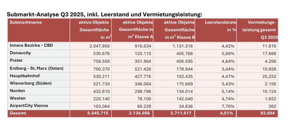 Dabei handelt es sich laut VRF allerdings um die Umwandlung eines Untermietvertrags in einen Hauptmietvertrag. Der Vorgang werde statistisch als Vermietung gewertet, habe aber keinen Einfluss auf den den Leerstand, den VRF mit aktuell 4,5 Prozent angibt. Eine weitere große Anmietung erfolgte in der Donaucity mit rund 17.700 Quadratmetern durch einen gemeinnützigen Großmieter, was einem Anteil von rund 21 Prozent entspricht. Insgesamt wurden 48 Abschlüsse im VRF-Bestand gezählt – zwei weniger als im zweiten Quartal, aber sechs mehr als im dritten Quartal 2024. Die niedrigste Leerstandsquote wurde mit 3,4 Prozent im Submarkt Wienerberg verzeichnet. Am höchsten war der Leerstand mit 7,8 Prozent in der AirportCity Vienna.